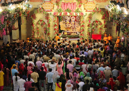 हैं। बैकुण्ठ में तो भगवान् वास करते ही हैं, किन्तु प्रभु ने जन्म की लीला मथुरा में की है। अतः जन्मोत्सव का आयोजन एवं दर्शन का महत्व मथुरा में सर्वाधिक एवं अलौकिक है । श्रीकृष्ण जन्माष्टमी के दिन प्रातः भगवान्र् की मंगला आरती एवं अभिषेक होता है। उसके उपरान्त लीलामंच पर सन्त महात्माओं की दिव्य उपस्थिति में प्रभु को पुष्पांजलि अर्पित की जाती है।